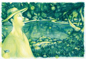 Lucciola ( Fireflies) A young man ventures in the woods while looking for fireflies;on another side of the forest,also a woman is looking for these marvels of nature. While they are following those bright trails eventually the find each other.Book project consisting of a brief prologue and 21 illustrations. Each image measures 43 x 30 cm, coloured pastels on paper, 2021-22
