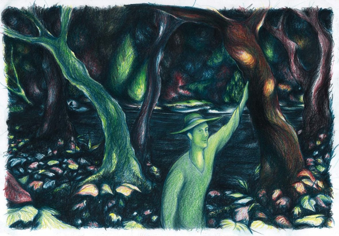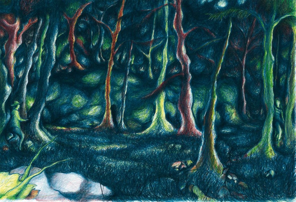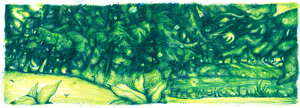 A young man ventures in the woods while looking for fireflies;