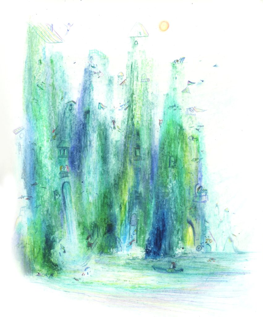 In order: A drop of water, Among the pebbles, Resting drop & Water city, oil pastels and coloured pastels.
